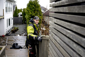 – Nå er det deilig, sier Isak Skjørestad når regnet går over til hagl og det er tre timer igjen av arbeidsdagen. Det er fredag, og tømrerjobben i hageprosjektet på Sola skal ferdigstilles før helgen.