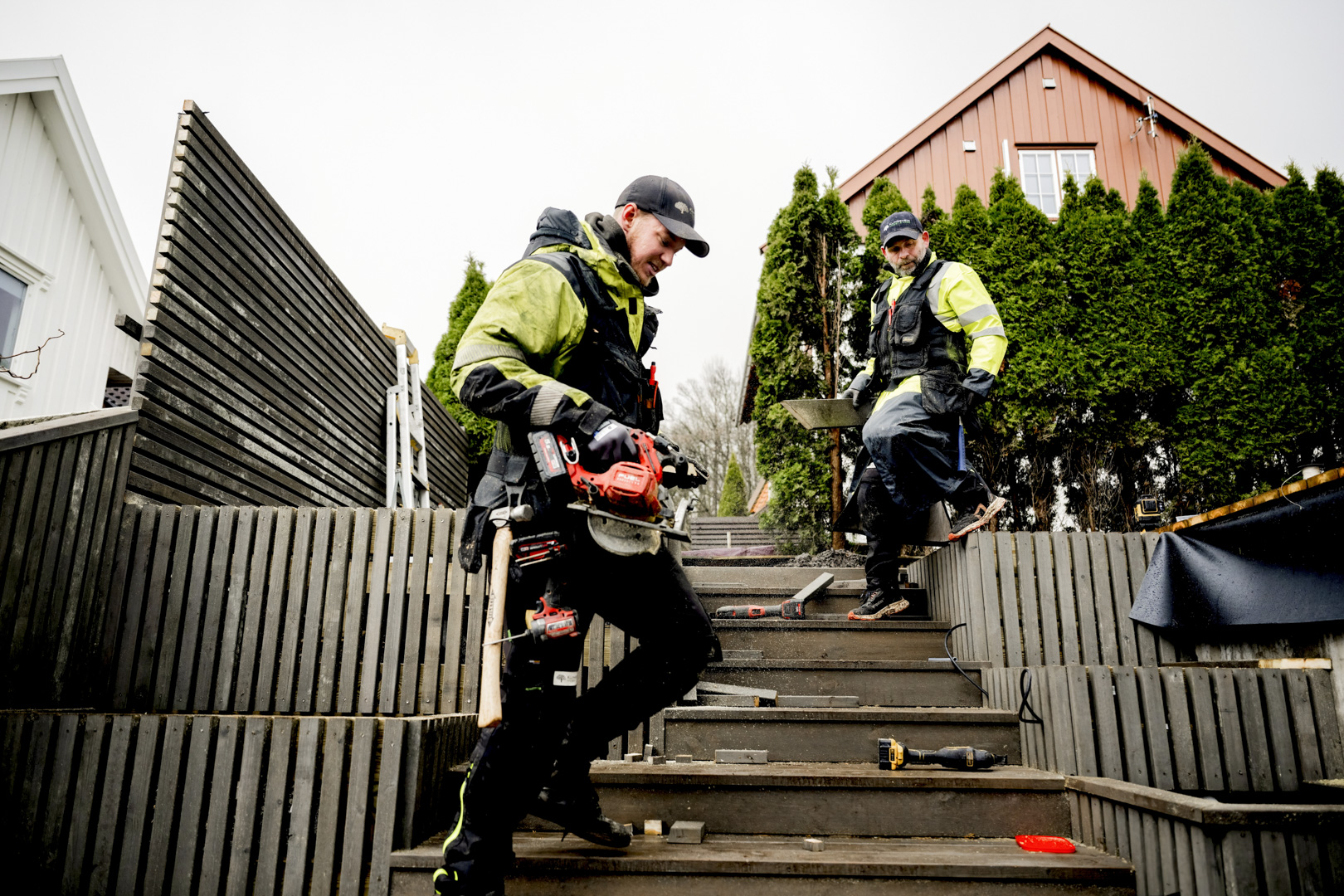 Isak Skjørestad og John Gunnar Nesvoll jobber med innspurten i et hageprosjekt. De har bygd denne trappa, fire levegger og to terrasser.