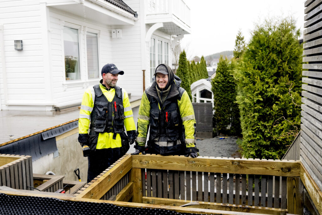 Det nærmer seg ettermiddag i hagen på Sola. Prosjektleder John Gunnar skal snart på en ny befaring, og tar først en kjapp avklaring med Isak om ferdigstillingen. Arbeidsstedet skal ryddes skikkelig før de forlater. Så skal de komme tilbake når et rekkverk på mål blir levert av produsent.